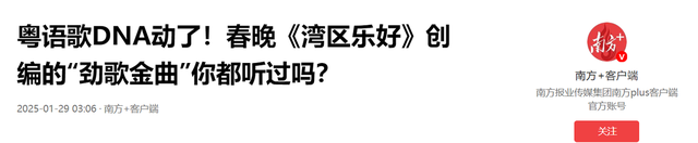 信源:粤语歌DNA动了!春晚《湾区乐好》创编的“劲歌金曲“你都听过吗?2025-01-29 南方+客户端